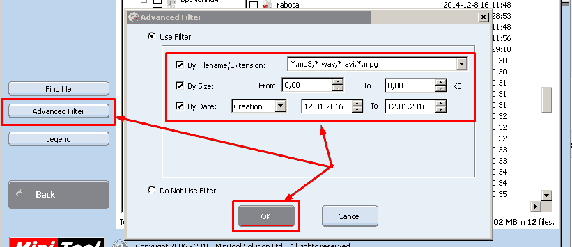 Я выбрал некоторые типы файлов для восстановления. Нажимаю на кнопку «OK».