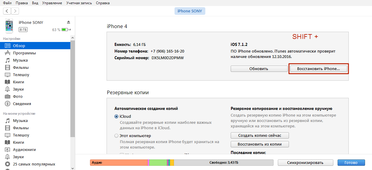 Шаг 4. Удерживая нажатой клавишу «Shift» на клавиатуре ПК с Windows (на Mac — «Option»), нажмите кнопку «Восстановить iPhone…».![]()