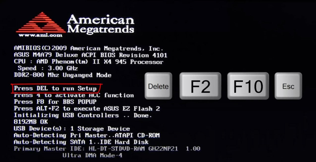 На скриншоте ниже показан экран приветствия AMI BIOS: F2 или Del — это кнопки для входа в настройки BIOS (на англ.: to run Setup).
