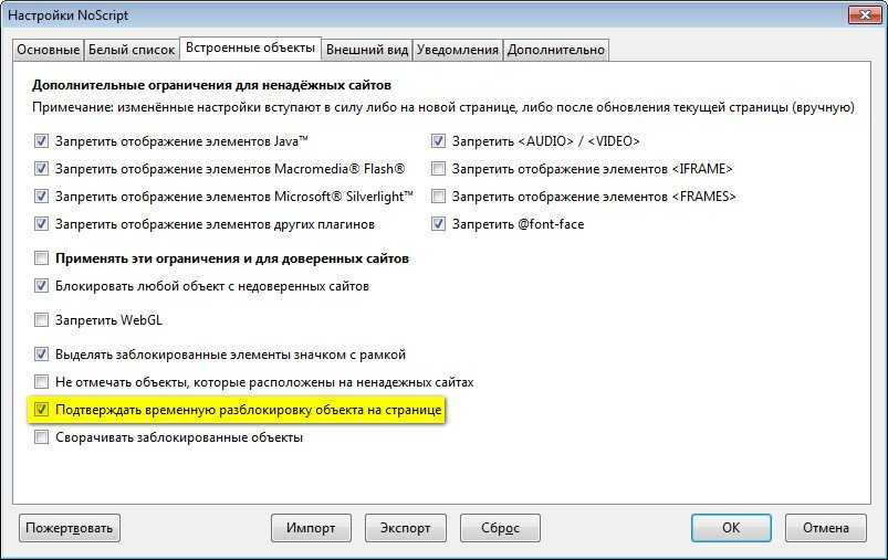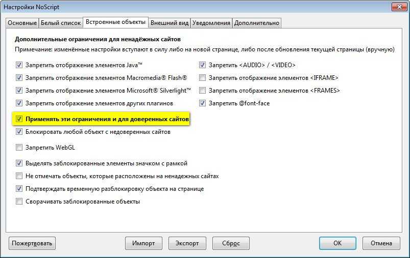 Это означает, что содержимое вроде Java, Flash, Silverlight и других плагинов будет загружаться на сайтах из белого списка по умолчанию. Если вы не хотите чтобы это произошло, вы должны произвести следующее изменение конфигурации NoScript во вкладке Настройка > Встроенные объекты.