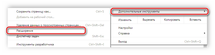 - Откройте «Дополнительные инструменты» – «Расширения».
