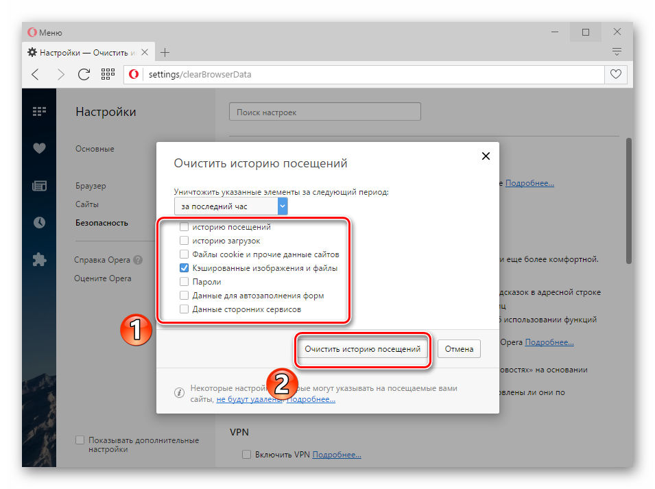 - Выберите «Очистить историю», отметьте галочками кэш и куки, подтвердите.