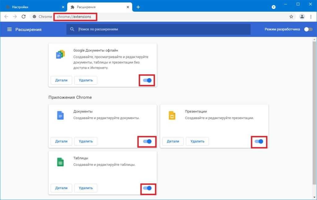 - Выставьте переключатели активации на всех доступных расширениях в положение «Откл.».