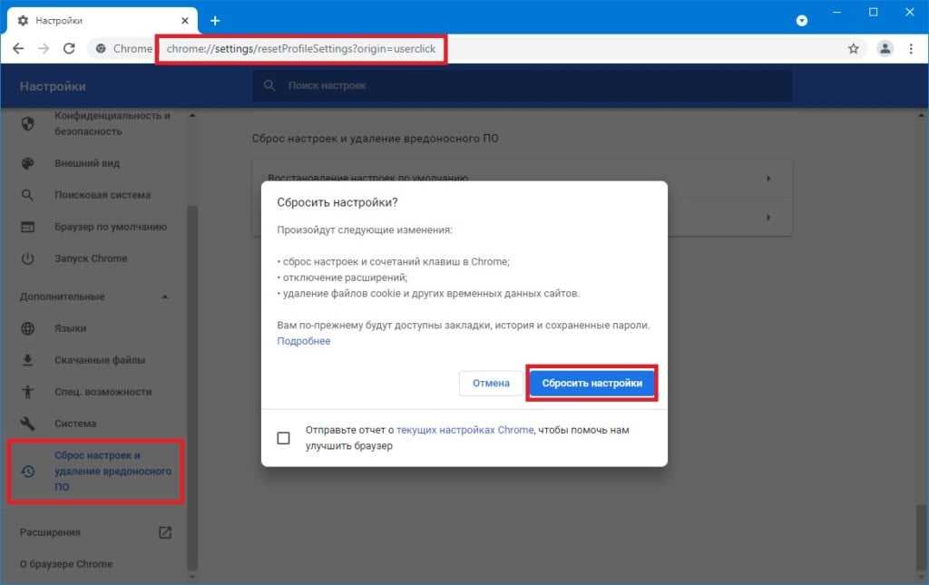 - Выберите пункт «Восстановление настроек по умолчанию», после чего выберите в новом диалоговом окошке опцию «Сбросить настройки».