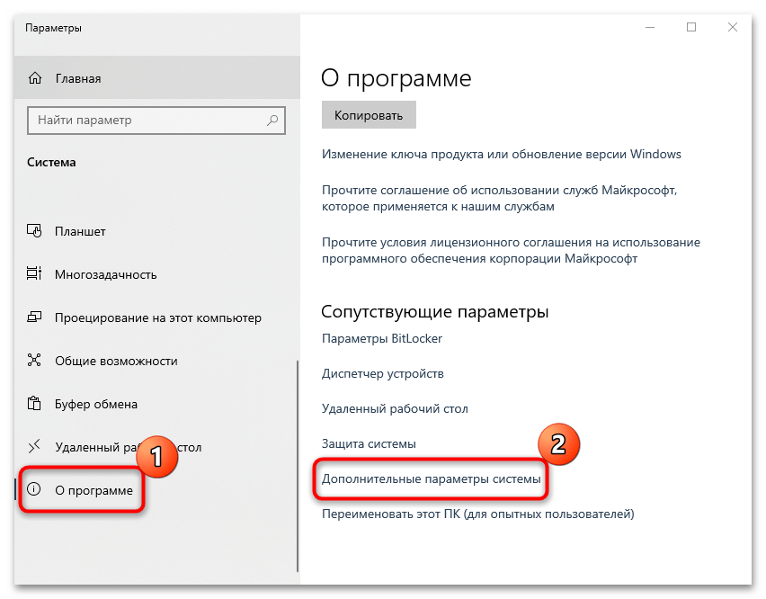 Выберите строчку «Дополнительные параметры системы» на вкладке «О программе».