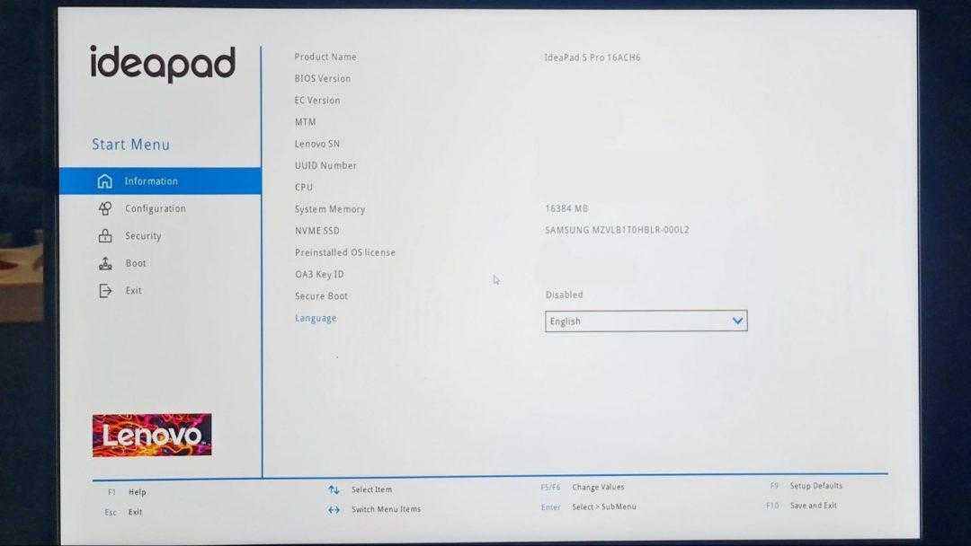 Экран BIOS на ноутбуке Lenovo. Вызывается клавишей F2 при загрузке. Нам нужно зайти на экран Boot