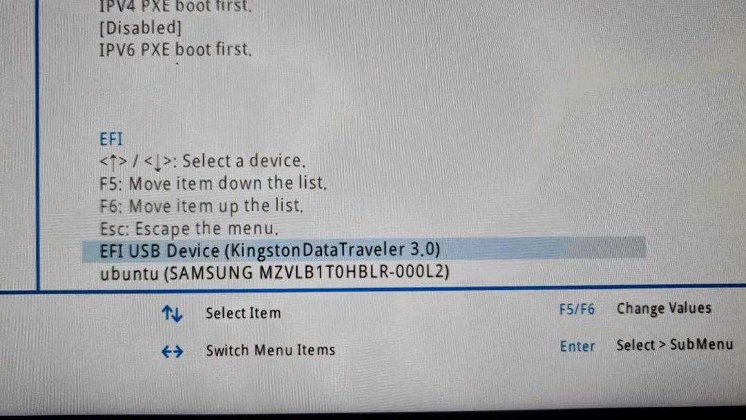 Экран Boot, в котором определяется, с чего загружаться. Нам нужно, чтобы вверху была USB-флешка. На этом скриншоте Ubuntu уже установлена на диск (строка внизу), но у вас там будет что-то другое