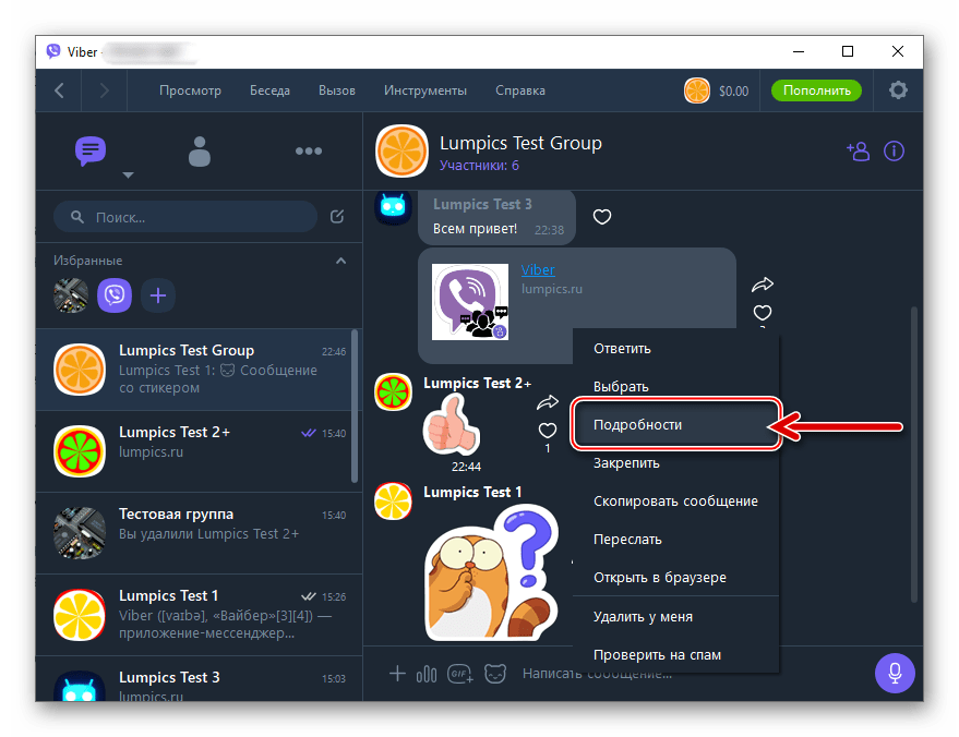 Аналогичным образом можно выяснить интересующий вопрос в случае, если Viber установлен на компьютере. В данном случае достаточно выбрать сообщение и нажать правой кнопкой мыши. Затем в выпавшем меню выбрать «Сведения» («Подробности»).