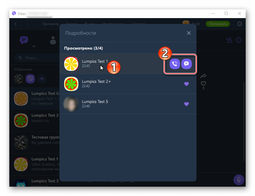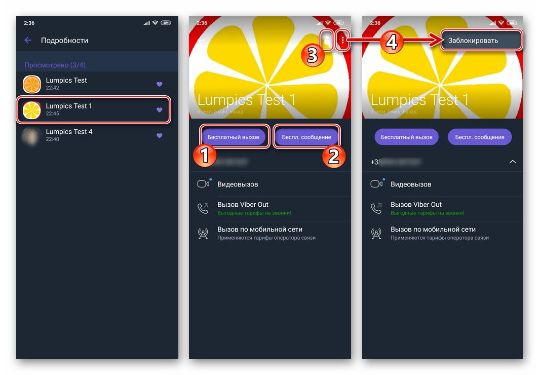 - Помимо решения озвученной в заголовке статьи задачи, вышеописанный экран даёт возможность открыть данные поставившего «сердечко» пользователя, даже если он не внесён в перечень «Контакты» вашего мессенджера. Для этого тапните по имени участника группового чата, а затем инициируйте одну из операций: 1 — «Бесплатный вызов», 2 — «Бесплатное сообщение», 3 —«Добавить в адресную книгу» или же 4 — «Заблокировать» (становится доступным после тапа по трём точкам вверху справа).