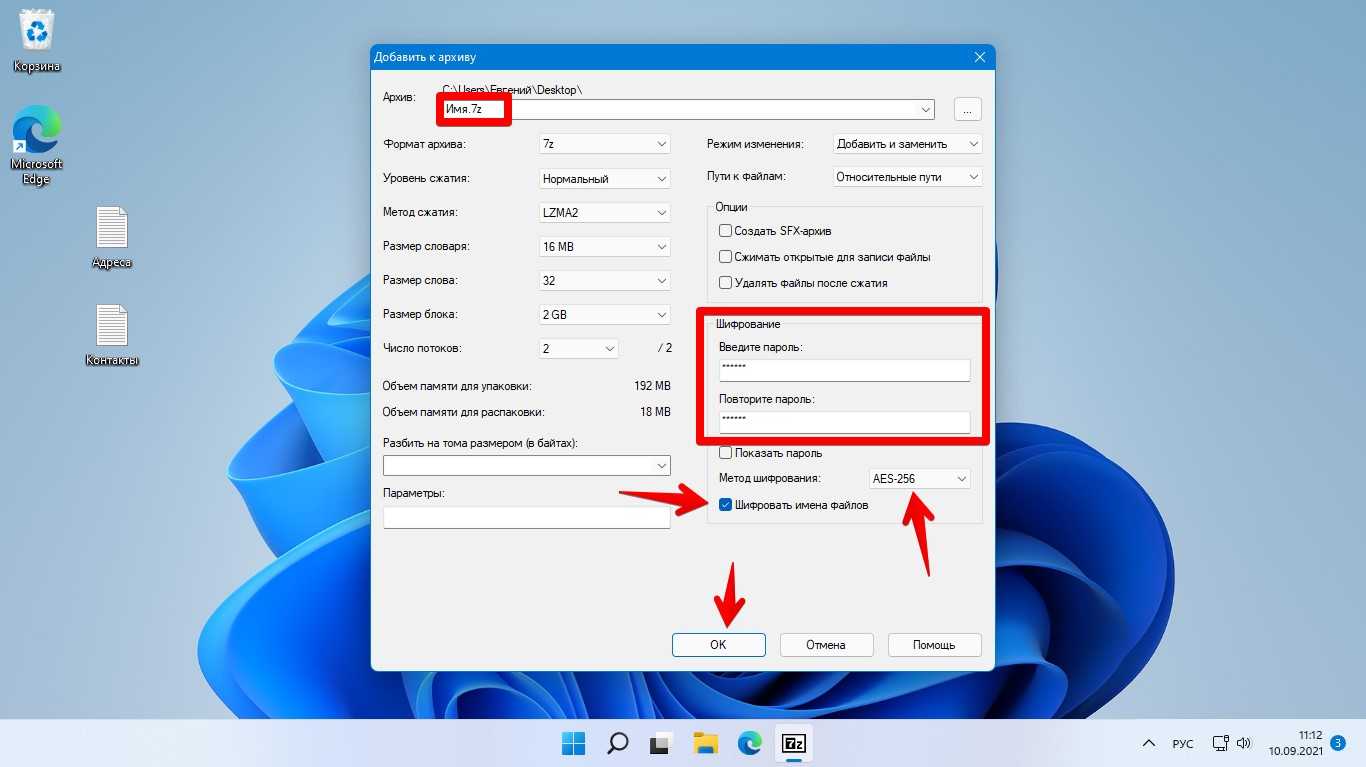 В окне «Добавить к архиву» задайте ему название и по необходимости измените место сохранения на компьютере.