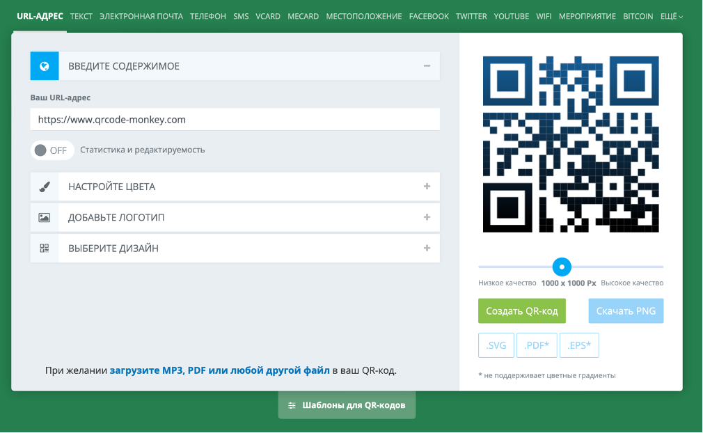 Сервис QRCode-Monkey сгенерирует QR-код, имея лишь ссылку, обычный текст, контакты, профили Facebook, Twitter, YouTube, SMS, номера телефонов, местоположение, адреса электронной почты или Wi-Fi. Цвет, логотип, дизайн и качество будущего кода – абсолютно все на ваше усмотрение.