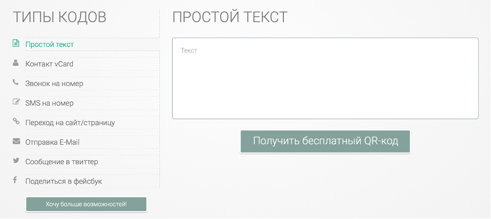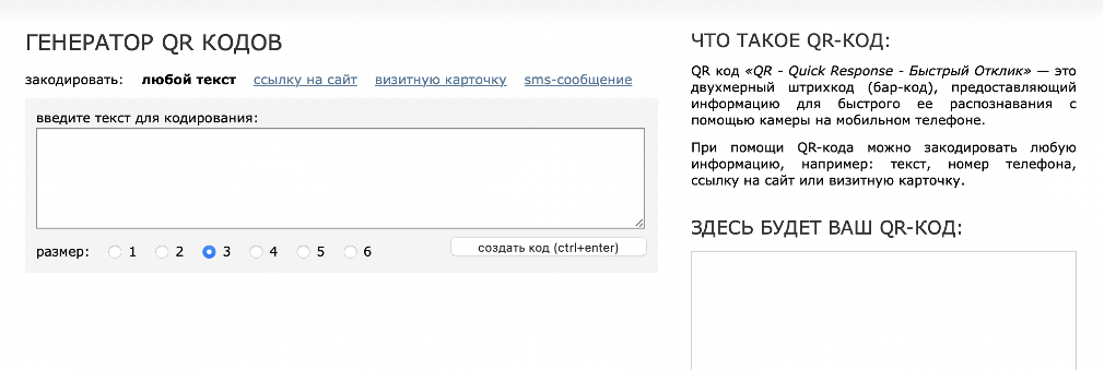 Qrcoder можно по праву назвать наиболее простым и удобным онлайн-сервисом по генерации QR-кодов. Его функционал не так широк, как у многих аналогов, однако он позволяет закодировать любой текст, ссылку, визитную карточку или SMS-сообщение. Вы сможете выбрать один из шести доступных размеров своего QR-кода.