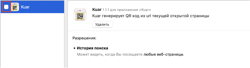 - Поставьте галочку рядом с расширением Kuar. Подтвердите выбор.