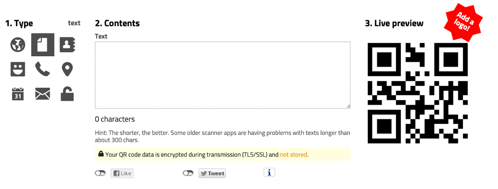 С этим сервисом вы сможете преобразовать в QR-код следующие типы информации – URL-адреса, текст, vCard, meCard, номер телефона, календарь, геолокацию события, профиль Twitter, Facebook, адрес электронной почты, Wi-Fi, PayPal и мессенджер. Более того, этот сервис позволит изменить цвет вашего кода и добавить логотип компании.