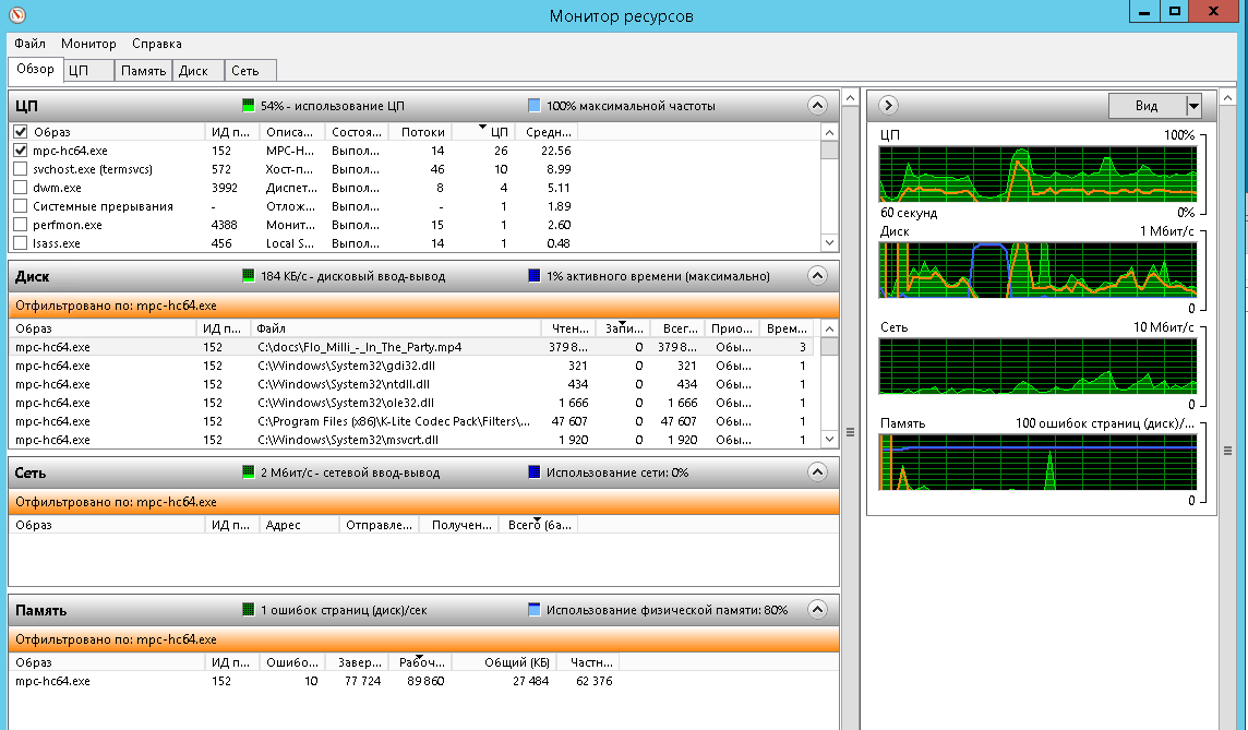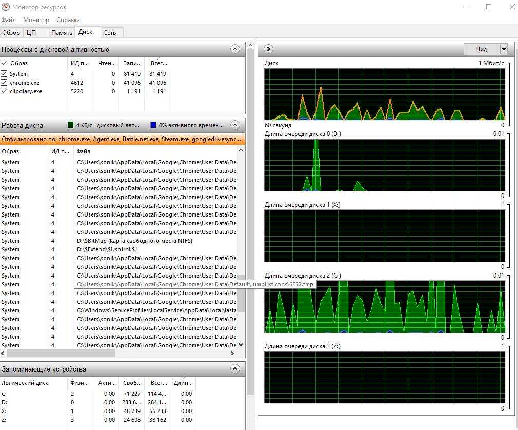 Сведения об активности процессора, памяти, дисков и сети представлены на отдельных вкладках, а вклада “Обзор” содержит сводную информацию по всем компонентам.