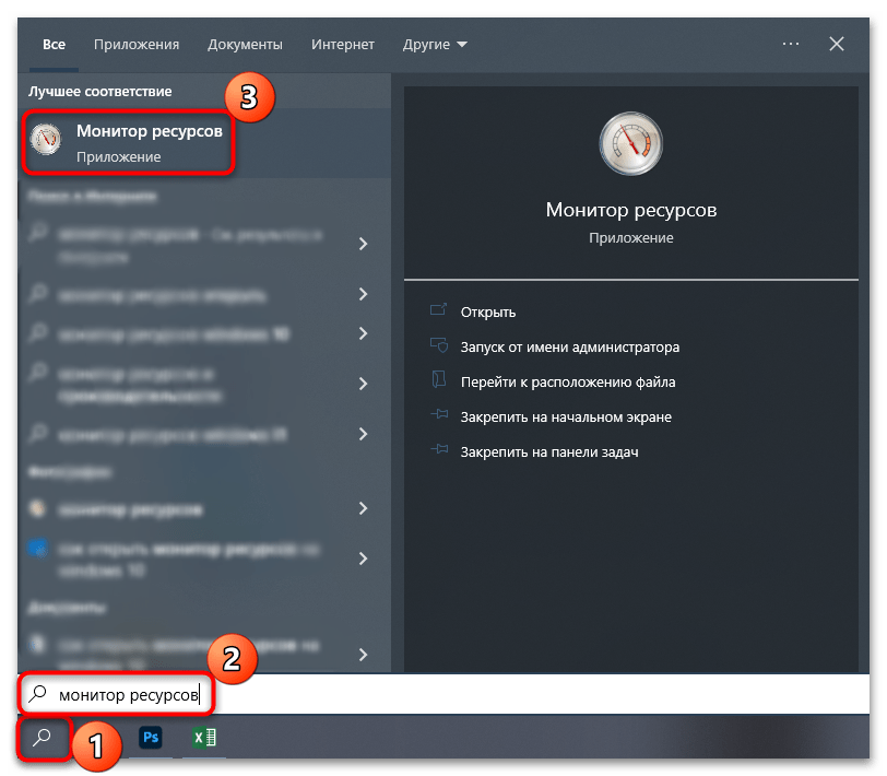 - Открываем «Монитор ресурсов» уже известным нам способом (при помощи меню «Пуск» или системного поиска).