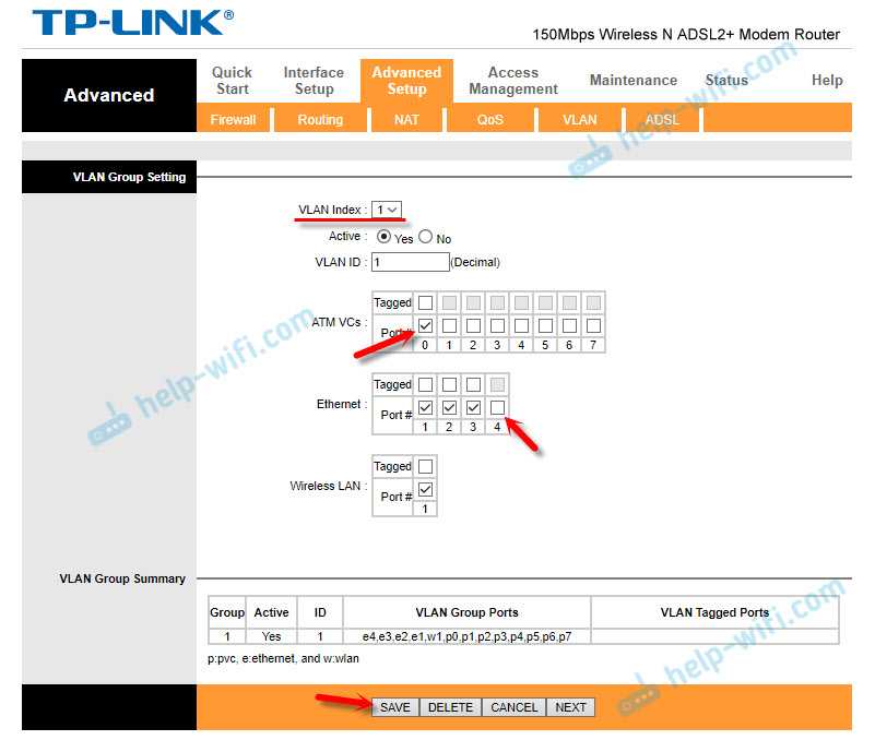 Соединение настроено, но это ещё не всё. Теперь надо правильно сгруппировать LAN-порты. Для этого переходим в раздел Advanced Setup -> VLAN -> Define VLAN Group.