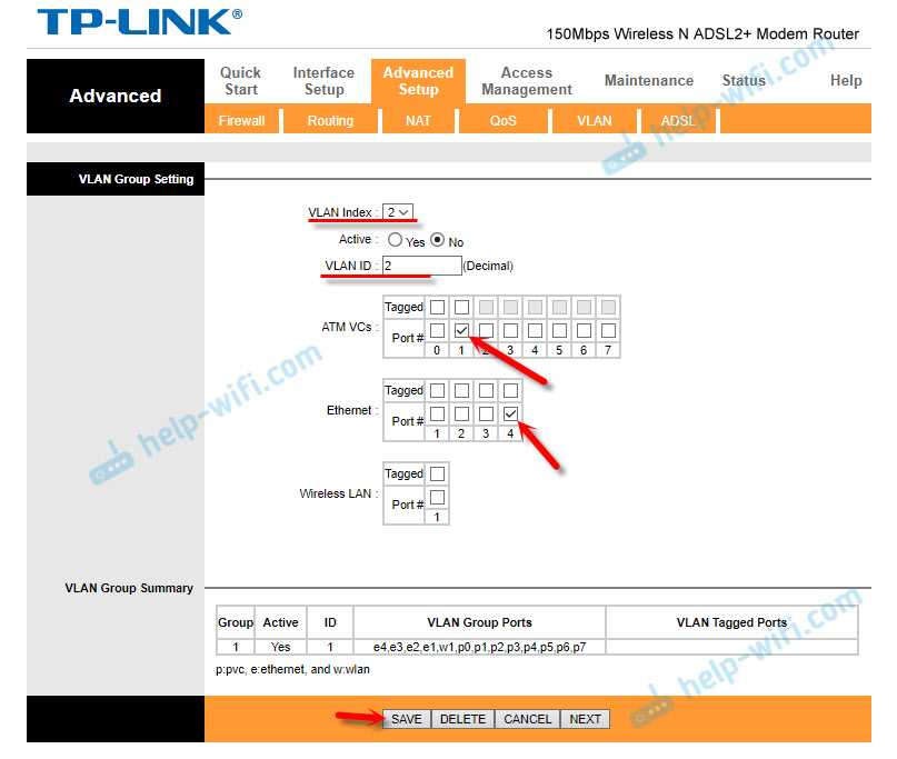 Дальше выберите «Vlan Index»: 2. Там есть поле «VLAN ID», поставьте в нем цифру 2. Выставьте настройки портов, как на скриншоте ниже. Сохраните настройки.