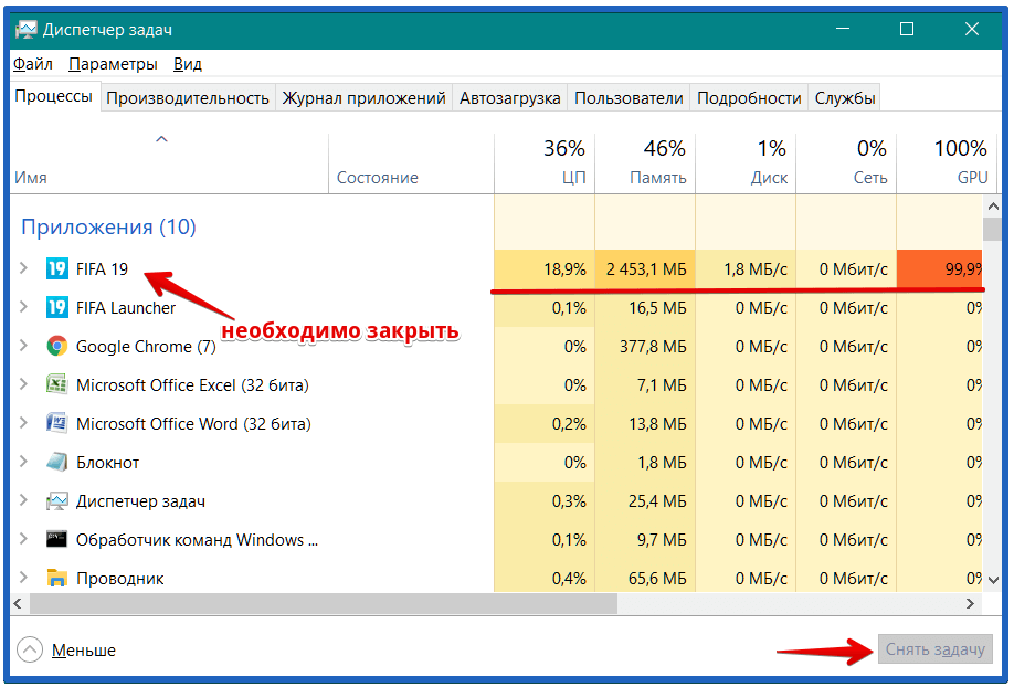 Если на компьютере нет свободных ресурсов для запуска браузера, он не сможет обработаться. В таком случае понятно, почему не отображается интерфейс Гугл Хрома. Чтобы высвободить оперативную память и процессор, нужно закрыть ресурсоемкие процессы. Сюда относится обработка файлов, монтаж, игры и подобное. Еще повышенную нагрузку может вызывать вирус. Вся информация о загрузке ресурсов отображена в «Диспетчере задач» (Ctrl + Alt + Del).