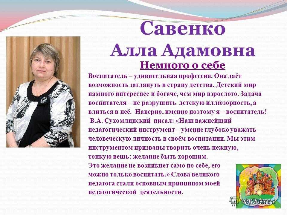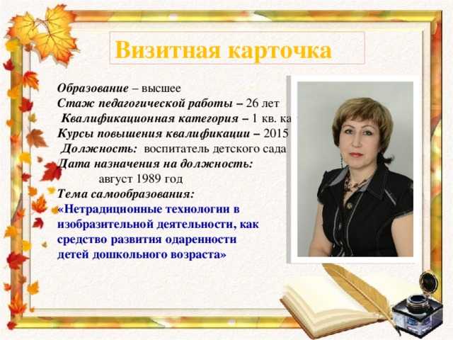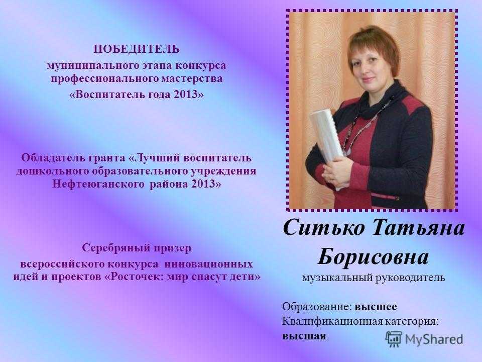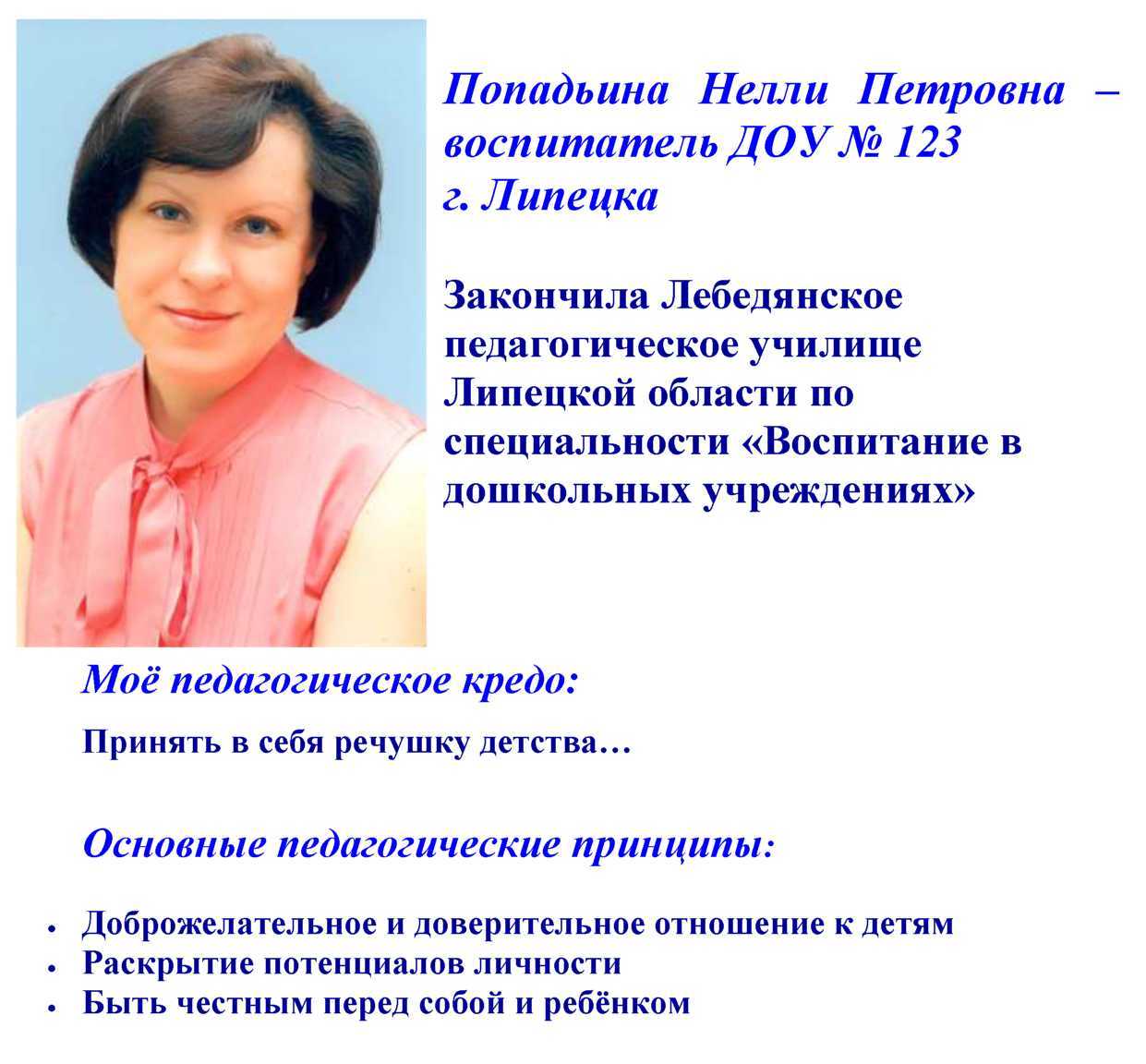 Мои достижения — это успехи моих воспитанников! Современному воспитателю сегодня нужно работать в условиях конкуренции, новых требований отчетности, стремиться к повышению личной квалификации и уметь самостоятельно оценивать результаты своей деятельности. Я стремлюсь совершенствовать свое мастерство, используя достижения педагогической науки и передовой практики, осваиваю современные инновационные технологии и методы. Стараюсь постоянно повышать своё профессиональное мастерство, профессиональный рост, участвую во всех мероприятиях, непосредственно связанных с моей работой,й.