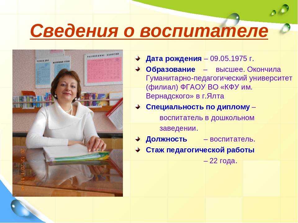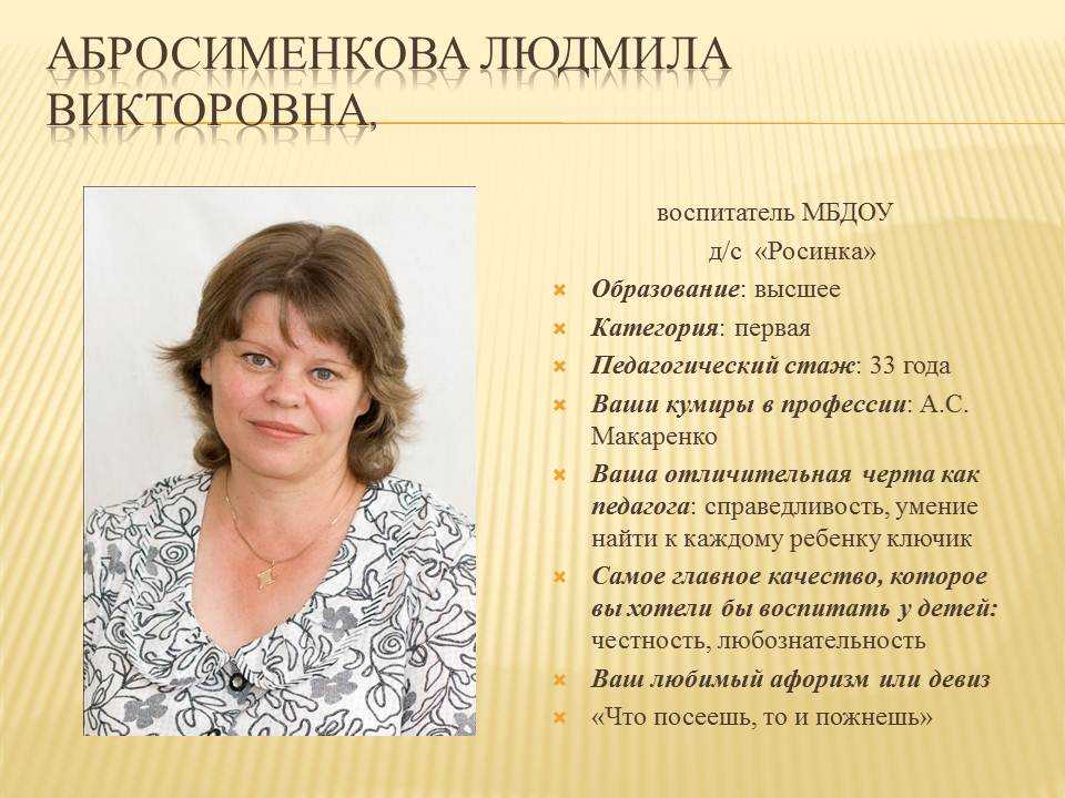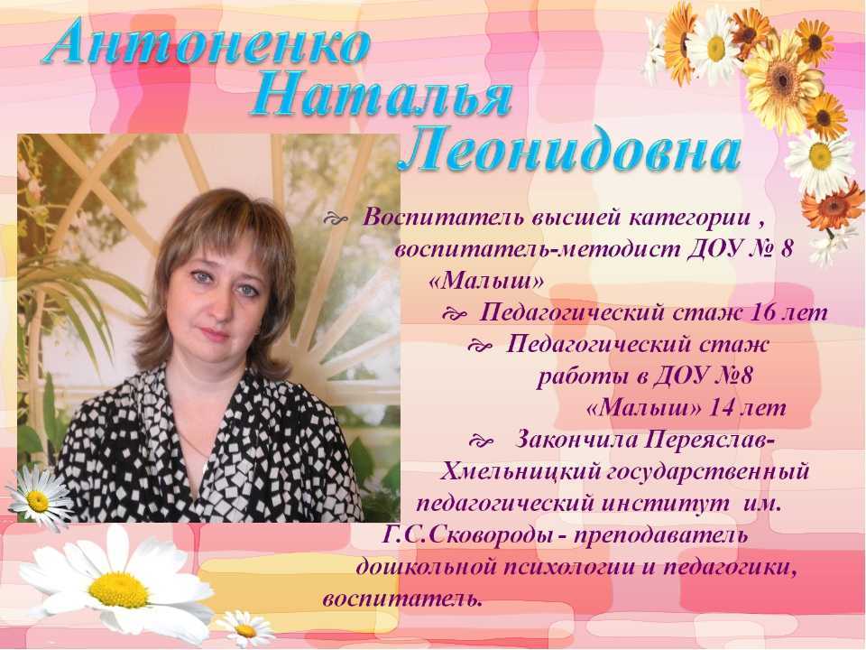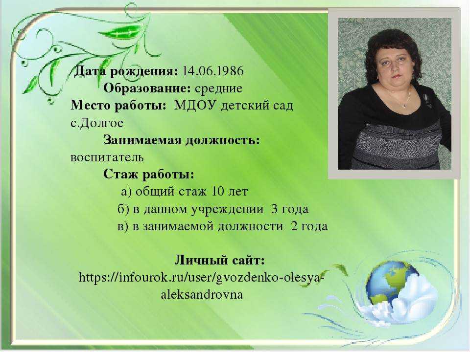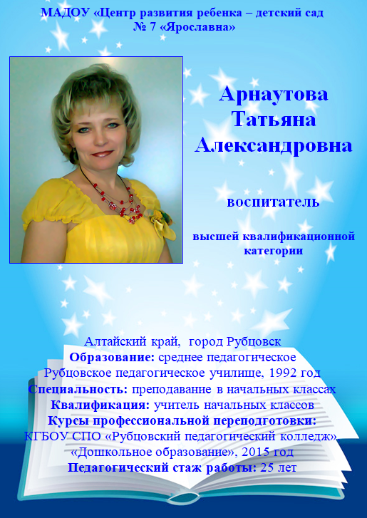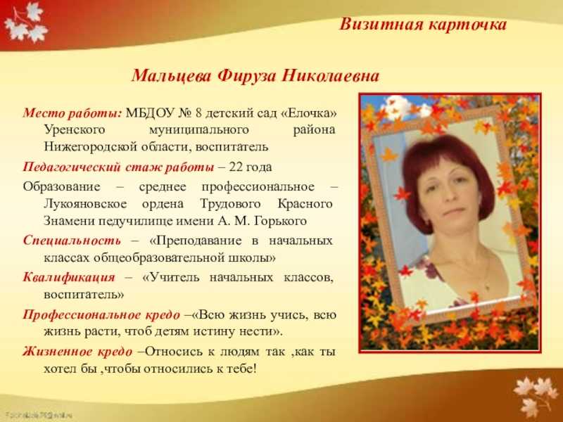 В коллективе детского сада «Аленушка» работаю с 1996 года. Имею высшую квалификационную категорию.В 2009 году окончила Негосударственное образовательное учреждение высшего профессионального образования «Восточная экономико-юридическая гуманитарная академия», г. Уфа по специальности — Педагогика и методика дошкольного образования, квалификация организатор-методист дошкольного образования. Где приобрела богатый багаж знаний во всех научных сферах, тем самым помогает мне в дальнейшей работе воспитателем. С огромным интерсом, я познаю и изучаю новые технологии в сфере образования, постоянно самообразовываюсь, пользуюсь современной литературой. В век информационных технологий стало возможным распространять опыт работы в сети Internet: публикую материалы на образовательных сайтах. Мои воспитанники активно принимают участие в муниципальных, региональных, республиканских, всероссийских, международных интернет-олиппиадах, конкурсах. Распространяю опыт работы в рамках региональных, републиканских семинаров для воспитатлей, муниципальных методический объединений. Вношу вклад в повышение качества образования, совершенствую методы воспитания, транслирую в педагогических коллективах опыт практических результатов своей профессиональной деятельности.