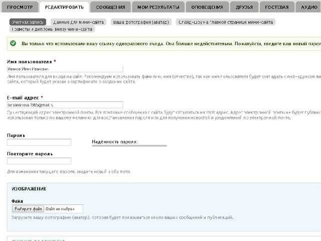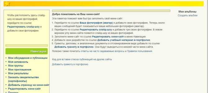 Востребованной функцией «Нашей сети» является создание личных страничек (мини-сайтов). Мини-сайт аккумулирует контактную информацию автора, его сферу интересов и достижения, полезные ссылки, методические материалы, а также ссылки на группы и публикации сети. Чтобы создать свой мини-ресурс, в меню с левой стороны выбирается кнопка «Мой мини-сайт», а затем заполняются поля профиля.