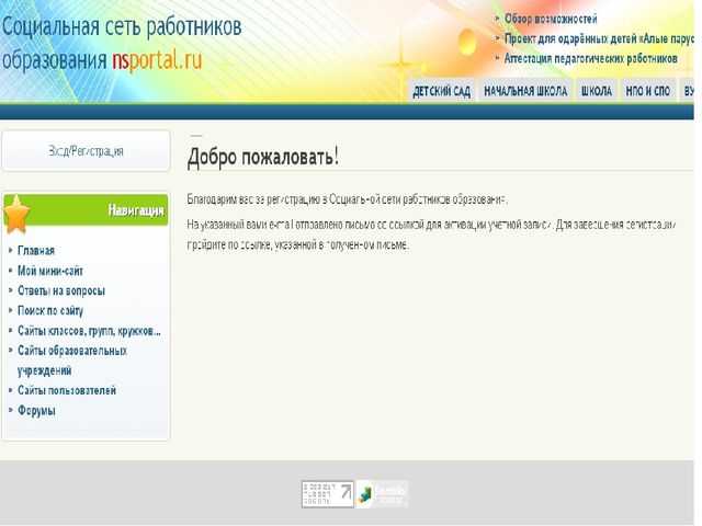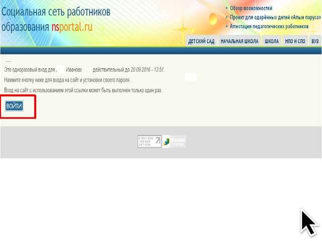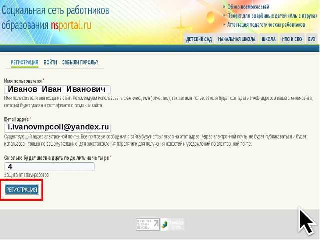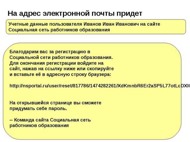 На адрес электронной почты придет сообщение : Учетные данные пользователя Иванов Иван Иванович на сайте Социальная сеть работников образования Благодарим вас за регистрацию в Социальной сети работников образования. Для окончания регистрации войдите на сайт, нажав на ссылку ниже или скопируйте и вставьте её в адресную строку браузера: http://nsportal.ru/user/reset/817786/1474282261/XdKmnbR6Er2aSP5L77otLcDXIGzQjWdYPjPfmGG7Gpg На открывшейся странице вы сможете придумать себе пароль. — Команда сайта Социальная сеть работников образования