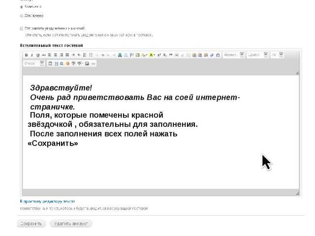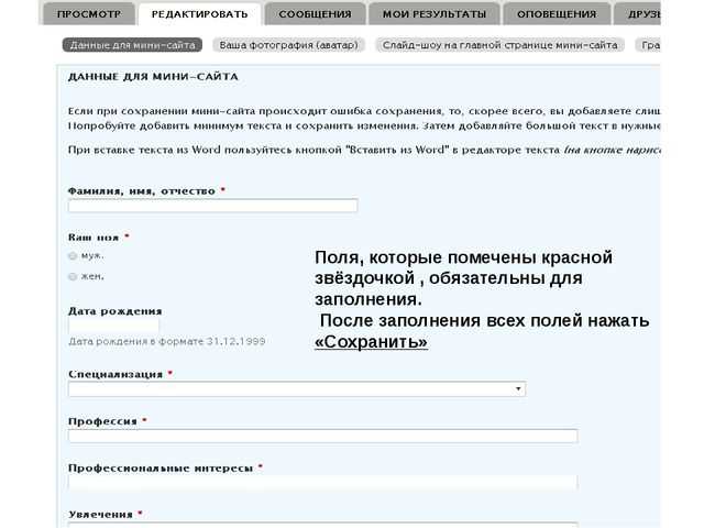Здравствуйте! Очень рад приветствовать Вас на соей интернет- страничке. Поля, которые помечены красной звёздочкой , обязательны для заполнения. После заполнения всех полей нажать «Сохранить»
