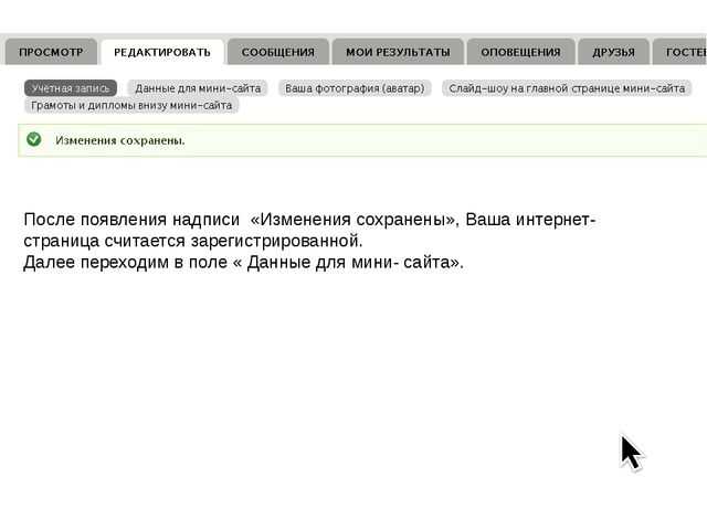 После появления надписи «Изменения сохранены», Ваша интернет- страница считается зарегистрированной. Далее переходим в поле « Данные для мини- сайта».