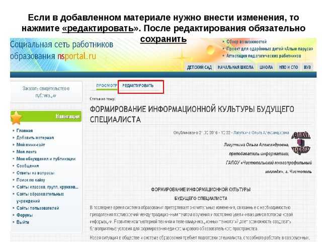 Если в добавленном материале нужно внести изменения, то нажмите «редактировать». После редактирования обязательно сохранить