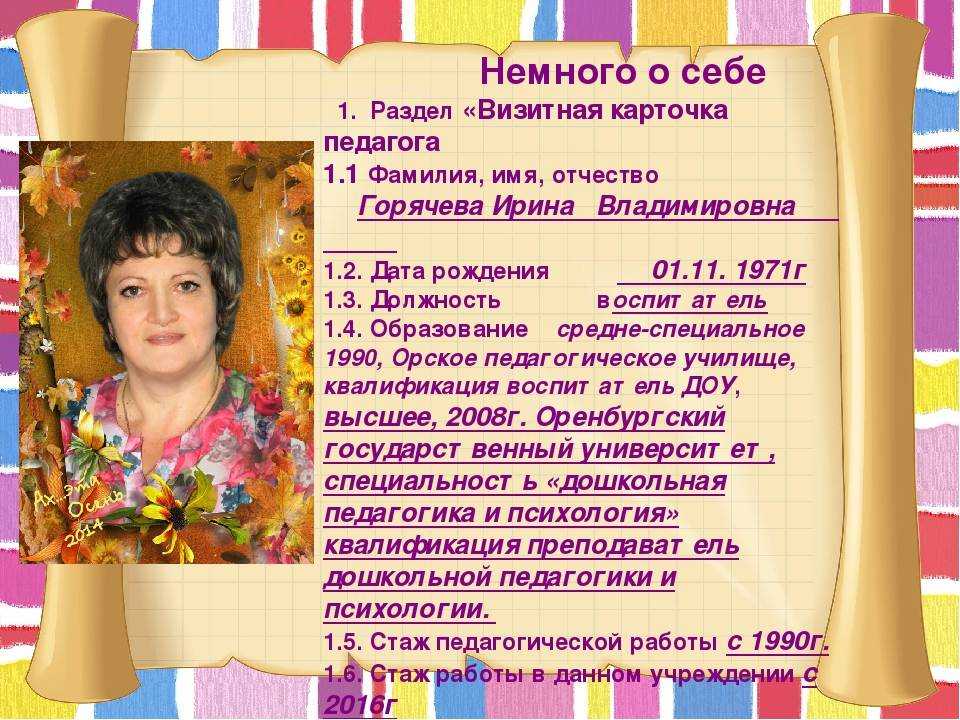 Педагог может указать полную информацию о себе: имя, место жительства, квалификационную категорию, учёную степень, учёное звание, общий и педагогический стаж, место работы, адрес учреждения, телефон, занимаемую должность, преподаваемые дисциплины, сведения о дополнительной нагрузке.