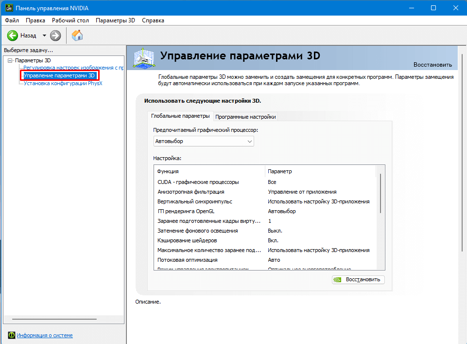 - Слева находится вкладка «Управление параметрами 3D», а затем переходим вкладку справа «Глобальные параметры»