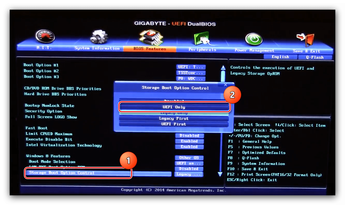 Изменение режима загрузки – Storage Boot Control выбираем запись UEFI only или указываем место, откуда необходимо брать файлы ОС для перезаписи (UEFI CD UEFI или Hard Drive) в зависимости от того на каком устройстве записаны данные дистрибутива.