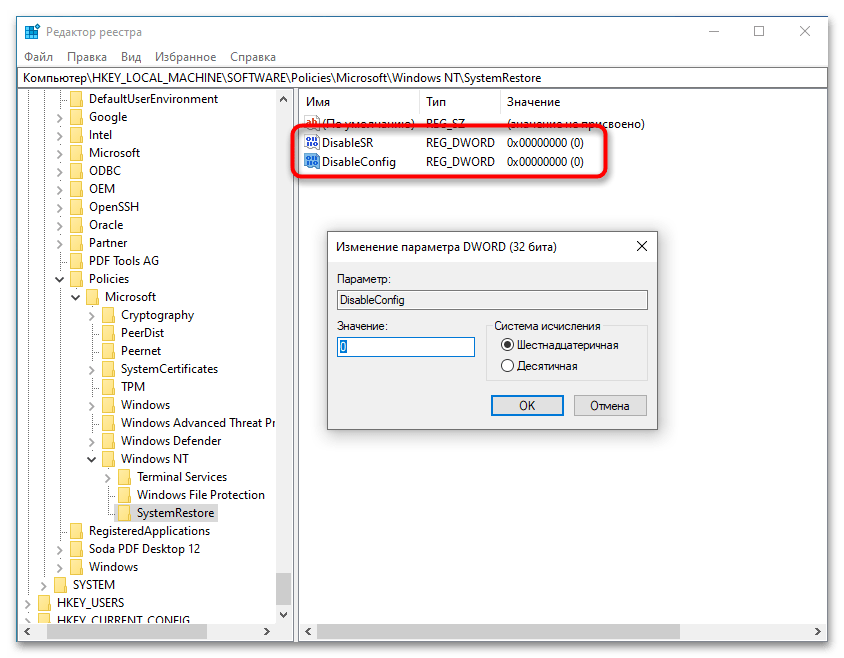 В центральной части окна найдите параметры «DisableSR» и «DisableConfig» и измените их значение на , для чего дважды кликните по каждому из редактируемых параметров и введите в открывшемся диалоговом окошке указанное значение.