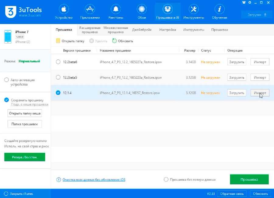 4. Далее выбираем раздел «Прошивка и JB» «Прошивка» и ставим галочу возле подходящей прошивки желательно не beta. Если нужно сохранить данные то ставим галочку «Прошивка без потери данных» и нажимаем кнопку прошить.