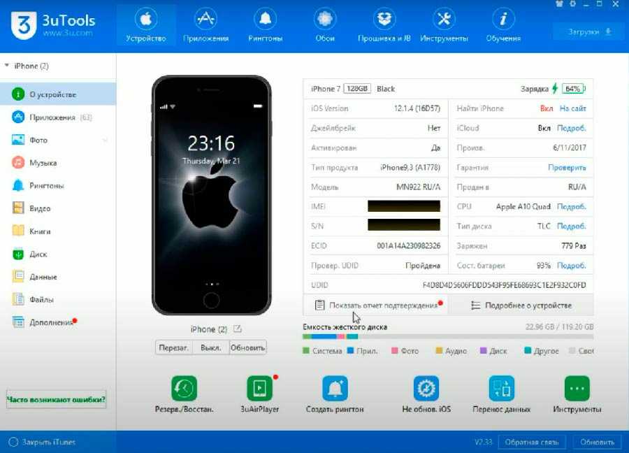 3. Потом через оригинальный кабель подключаем iPhone к компьютеру должно появиться уведомление даем согласие на подключение и после чего 3uTools распознает ваш iPhone и появится такое окошко. Здесь довольно много полезной информации.