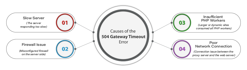 The possible causes that trigger a 504 Gateway Timeout error are:1. Slow server speed2. Insufficient PHP workers3. Problems with the Firewalls4. Network Connection