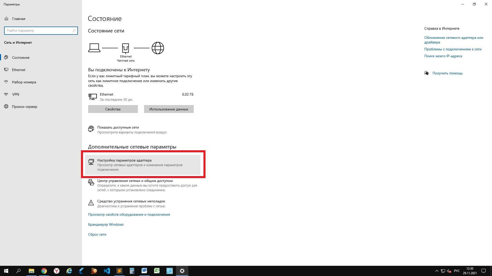 3) Нажмите на Изменение параметров адаптера на левой панели.