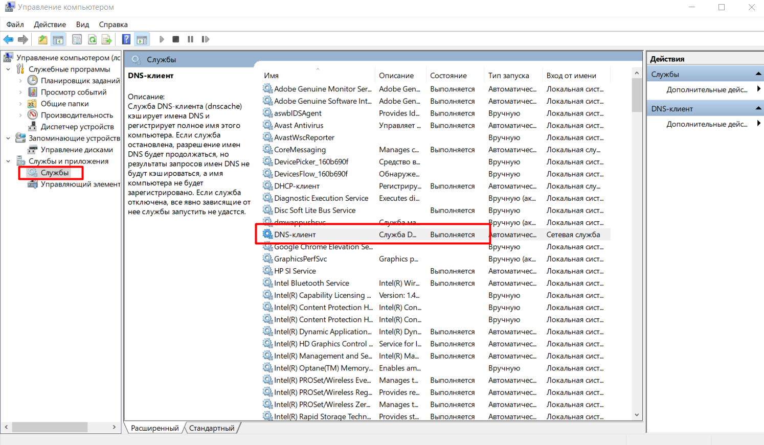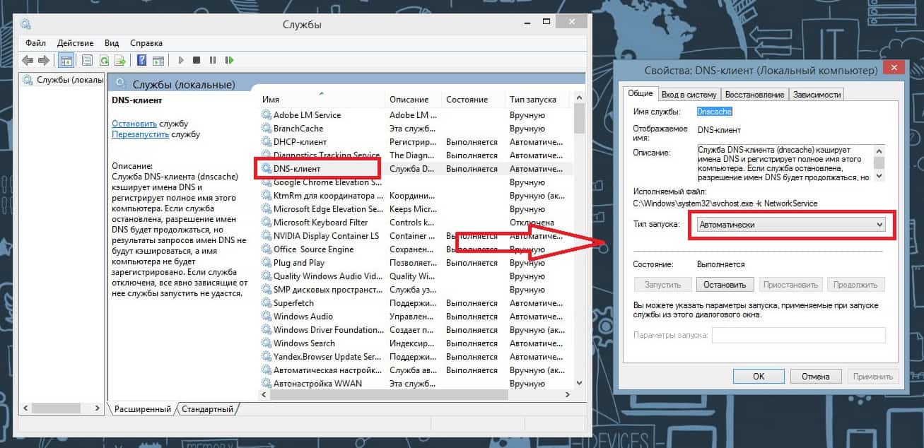 В некоторых случаях ошибка ERR_NAME_NOT_RESOLVED может появиться и после этого. В такой ситуации необходимо проверить состояние службы, отвечающей за корректное функционирование DNS-клиента. Вполне возможно, что может потребоваться ее перезапуск, а если она остановлена, то и ручной старт.