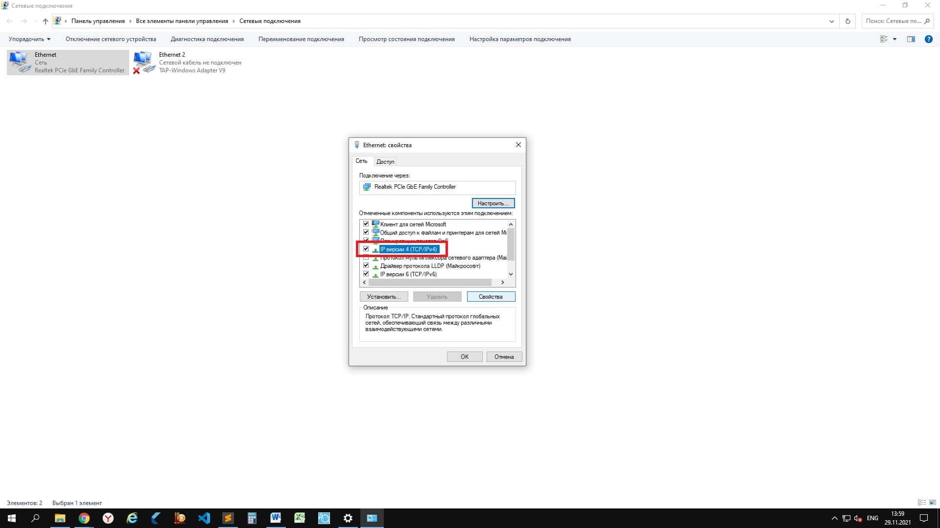 Откройте сетевые подключения. Нажмите правой кнопкой мыши и выберите свойства на том, которое осуществляет доступ к интернету.