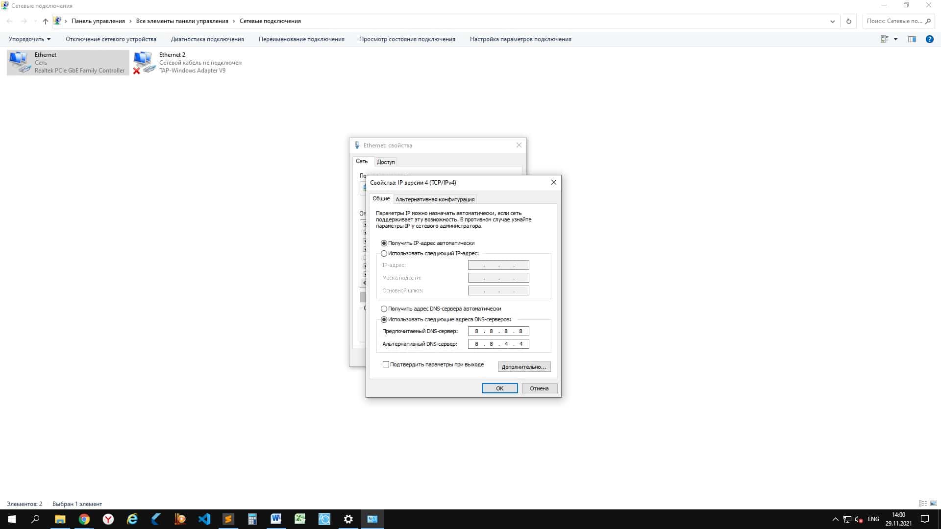 В противном случае вам надо будет указать два адреса. Основным должен стать 8.8.8.8. Кроме того, понадобится дополнительный вариант. В качестве альтернативы укажите 8.8.4.4. Выглядеть это будет следующим образом: