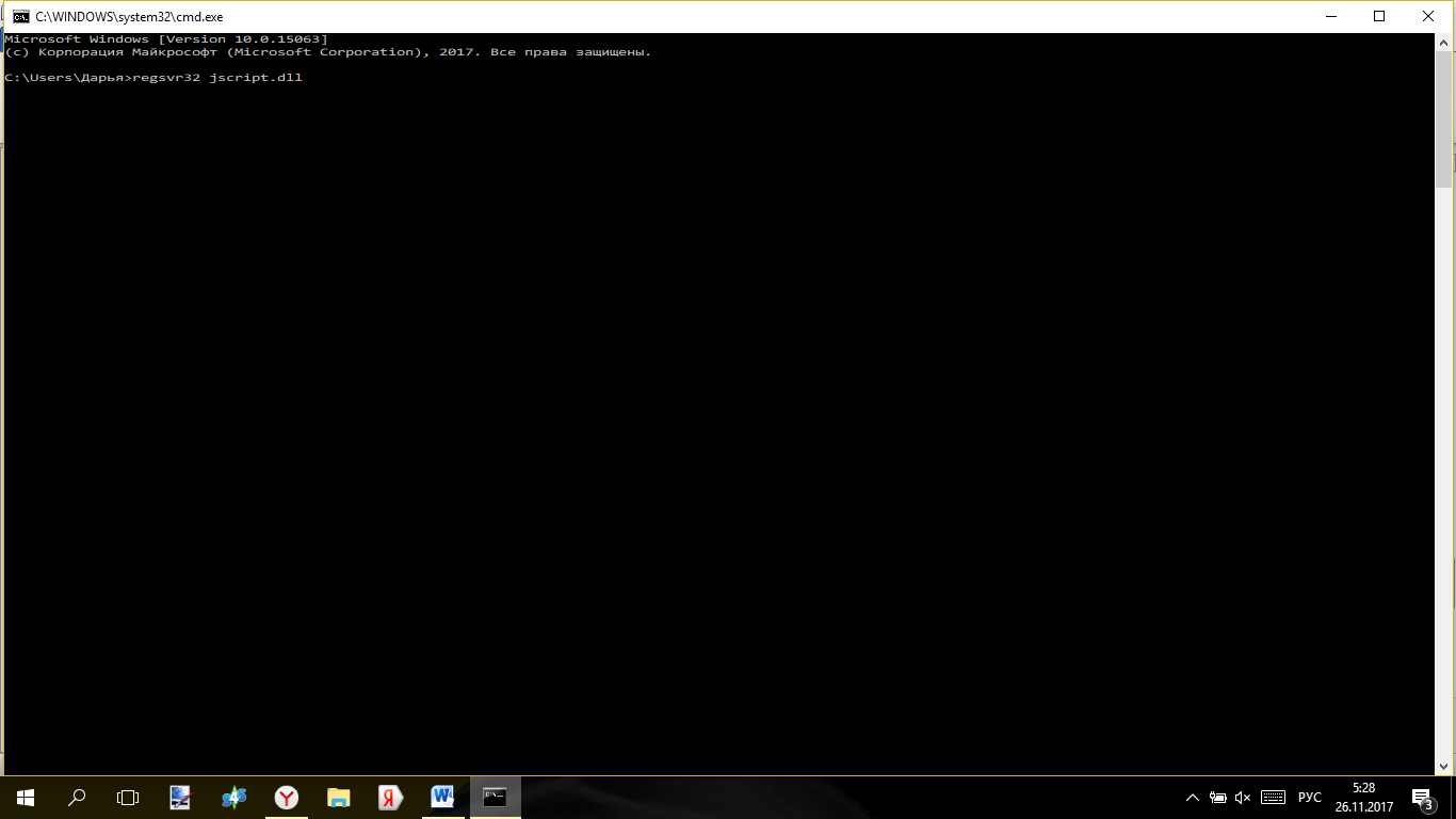 3Откроется командная строка, в которой необходимо скачала пропечатать regsvr32 jscript.dll и нажать Ввод, а затем – regsvr32 vbscript.dll, после чего также нажать Ввод;