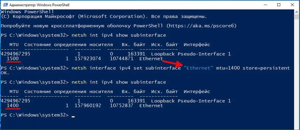 После выполнения команды проверьте, изменился ли размер MTU сетевого адаптера командой: netsh int ipv4 show subinterface.