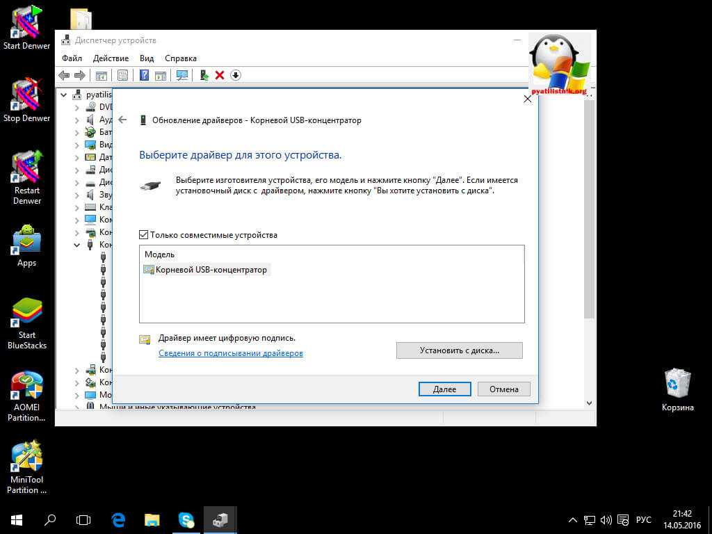 Обязательно должен быть предложен драйвер «Корневой_USB-концентратор» → «Далее»