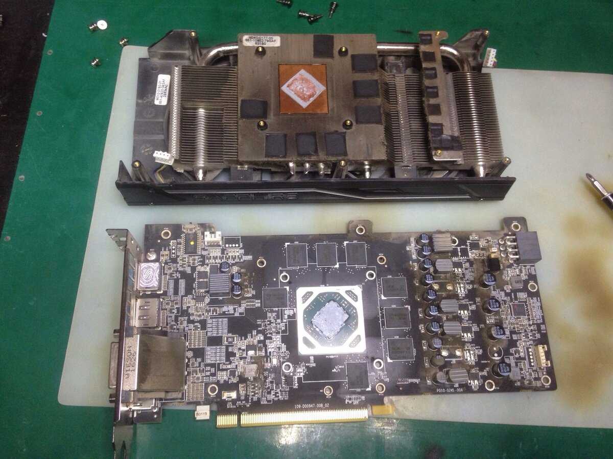 Отключаем духовку, видюха пусть остывает внутри. Если выпаивали конденсаторы — припаиваем. Сразу можно не намазывать термопасту, а просто поставить радиатор с кулером, чтобы быстренько глянуть, заработала ли система и в случае удачи — снять видеокарту и уже всё сделать капитально, т.е. намазать термопасту, установить радиатор, кулеры и капитально всё завинтить.