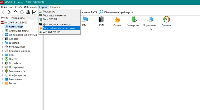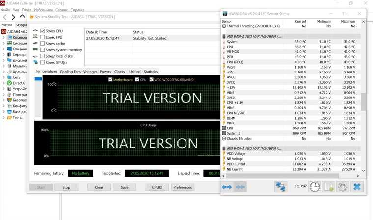 При более низких температурах в простое можно начинать тестирование под нагрузкой. Не закрывайте окно HWiNFO и запускайте AIDA64, выбрав тест стабильности.