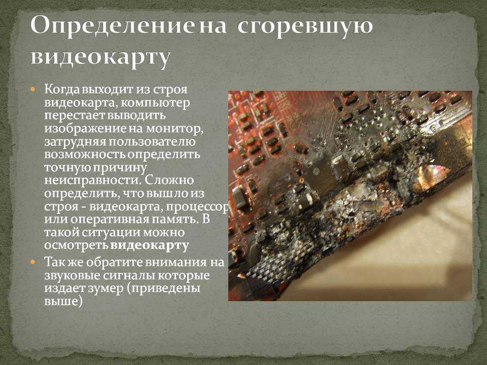 Существует ряд признаков, по которым можно определить, сгорела видеокарта или нет: