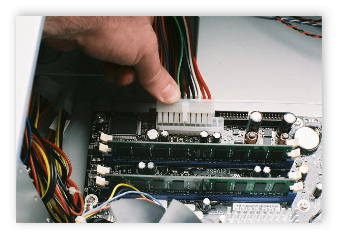 - Проверьте подключение и работоспособность блока питания. Во время запуска системы вентиляторы дополнительного охлаждения и кулер процессора должны работать. Кроме этого убедитесь в том, что выполнено подключение БП к материнской плате.