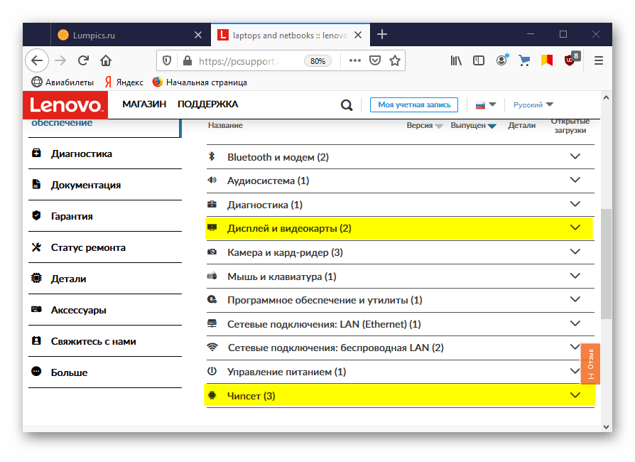 Большинство ноутбуков оснащено двумя видеокартами, поэтому также скачиваем ПО для чипсета и встроенного графического процессора. Подробную инструкцию по обновлению драйверов на примере ноутбука Lenovo вы найдете на нашем сайте.