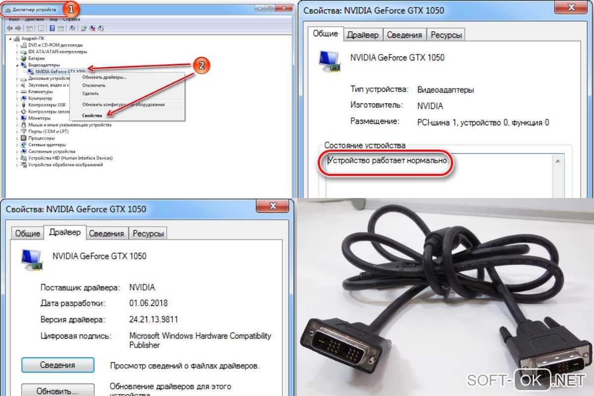 - Сбой драйверов: проверить этот пункт очень просто. Нужно зайти в Диспетчер устройств, кликнуть по вкладке видеоадаптеров, выбрать монитор и кликнуть по нему правой кнопкой мышки. Во вкладке «Свойства» выбирают раздел с общими настройками. В нем должна быть надпись «Устройство работает нормально», а во вкладке «Ресурсы» — «Конфликты не обнаружены». Если это не так, переходят во вкладку драйверов, удаляют их, перезагружают компьютер и устанавливают драйвера заново.